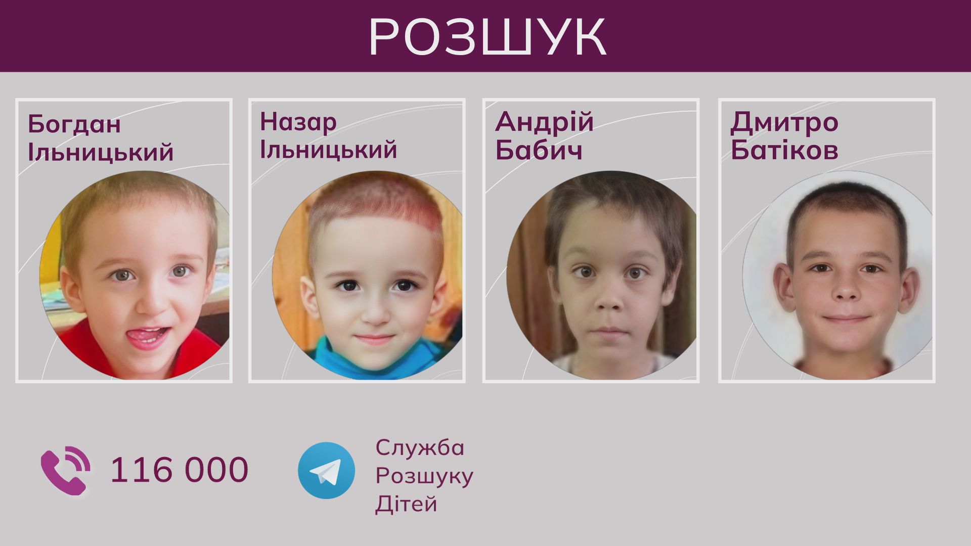 Під час повномасштабної війни на тимчасово окупованих територіях Херсонської області зникли четверо хлопців: шестирічні братики-двійнята Богдан і Назар Ільницькі, чотирнадцятирічний Андрій Бабич та шістнадцятирічний Дмитро Батіков. Де вони перебувають зараз — досі невідомо.